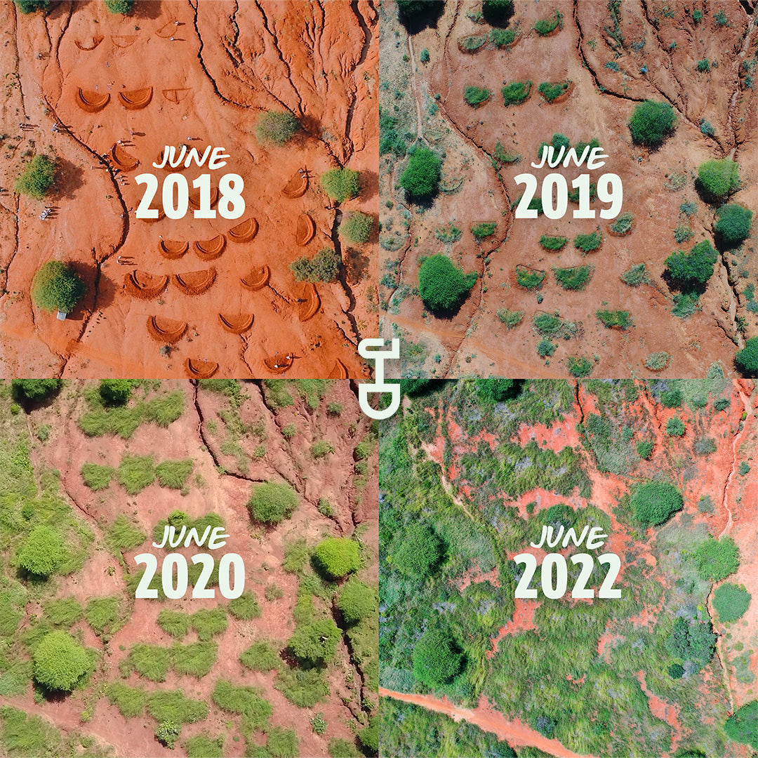 Eén van de manieren waarop ze dat doen, is door zogenaamde ‘water bunds’ te graven. Dit zijn halvemaanvormige kuilen die regenwater opvangen. Dankzij deze bunds heeft het water dat valt meer tijd om de grond in te trekken. Zo krijgen zaden de kans om te ontkiemen. Het resultaat: al na één seizoen ziet het landschap er groener uit. En blijft de bodem koel. Cool, toch?